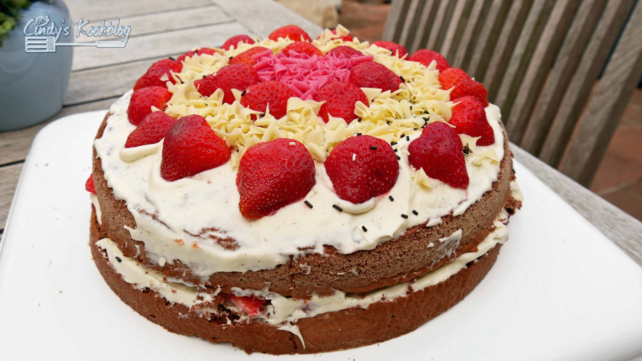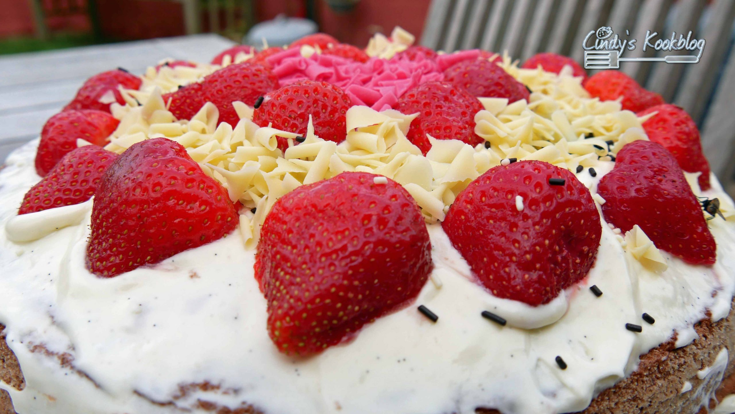 Lepel er de rest van de rumsiroop over en bestrijk de bovenkant met de aardbeiengelei.Heb je een dubbele portie room gebruikt, dan kun je de bovenste laag er ook nog mee insmeren.