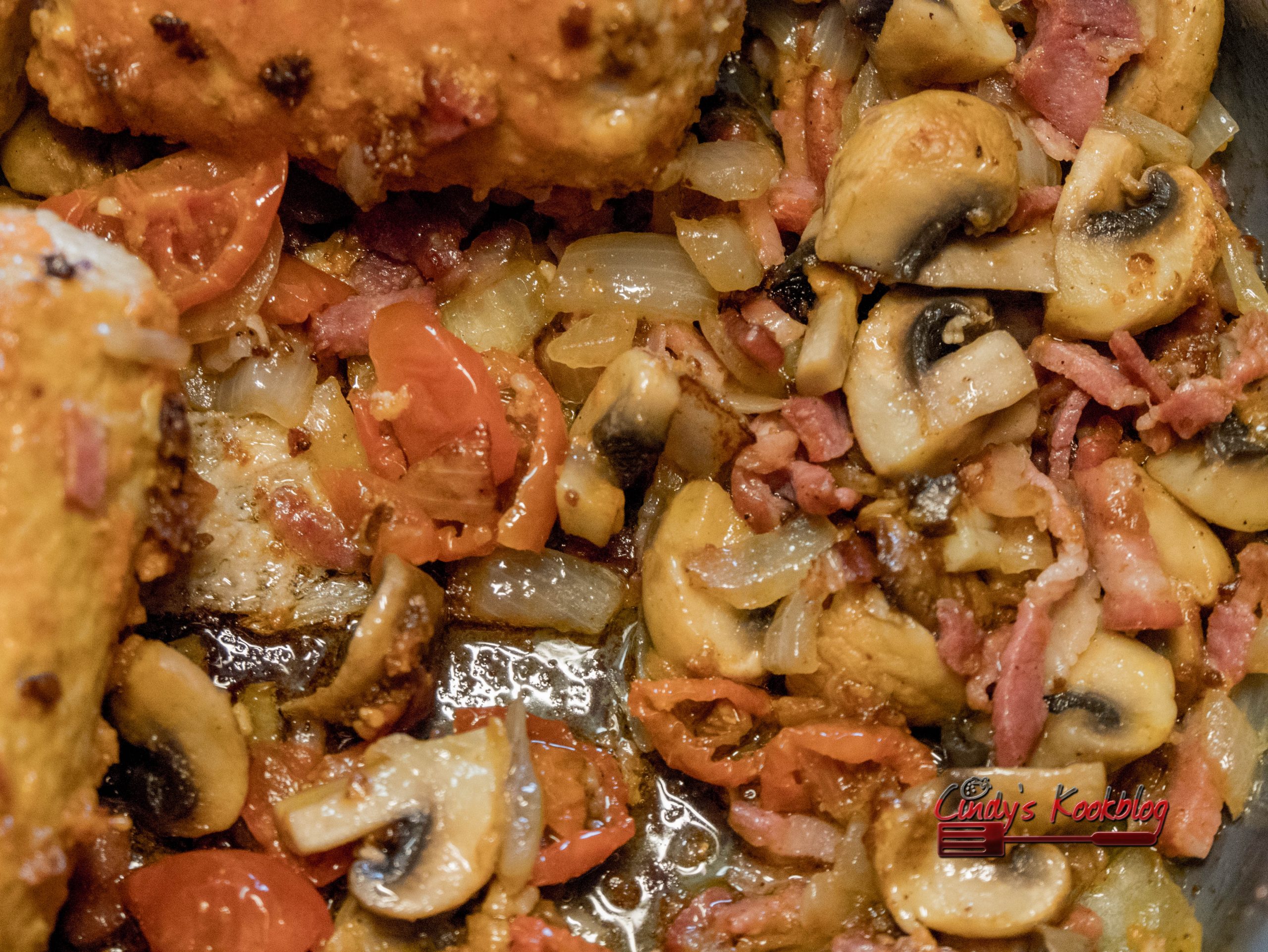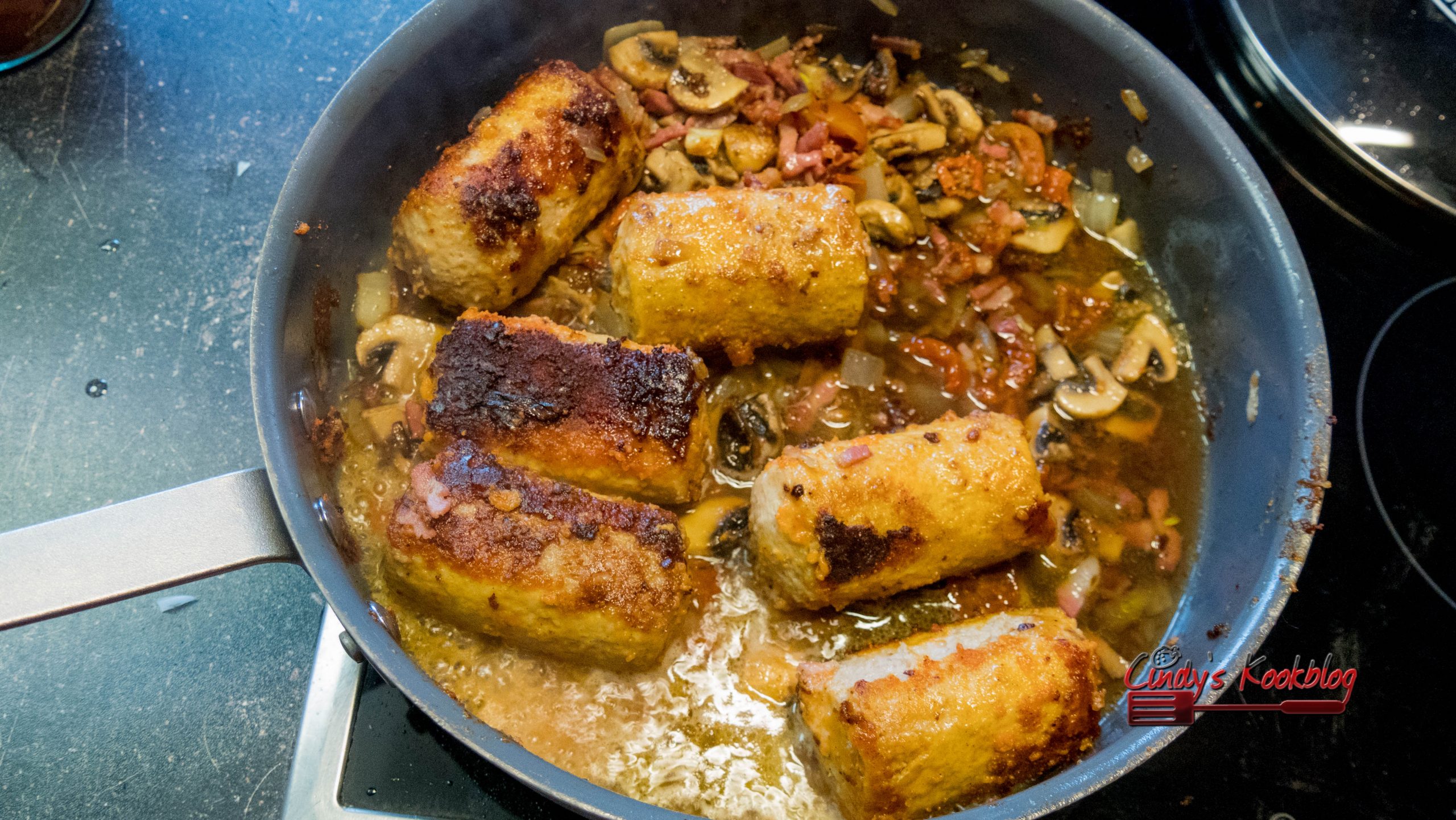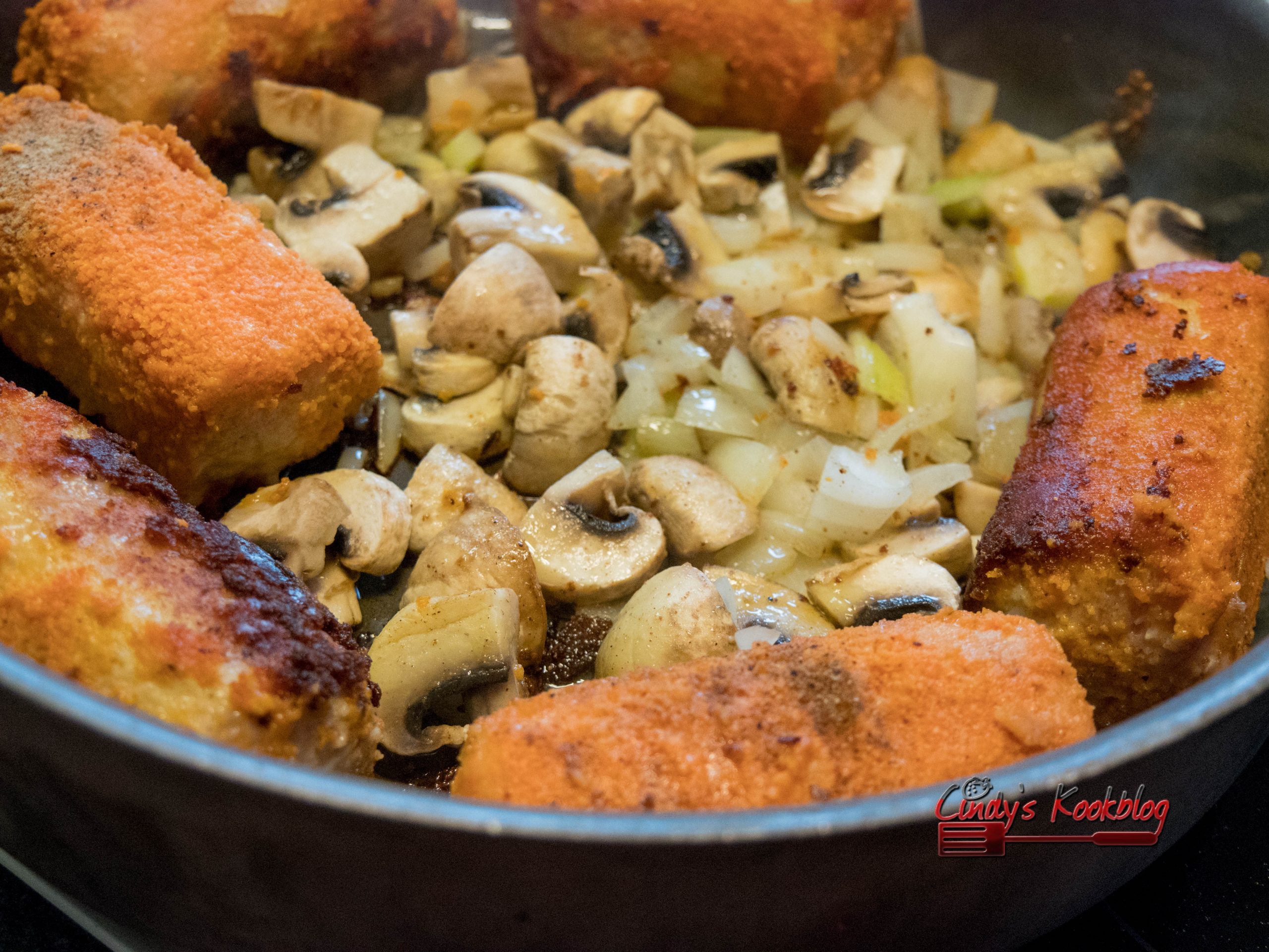 Bak de boomstammetjes bruin en eens ze kleur hebben, doe je er de ui, champignon  en spekblokjes bij.