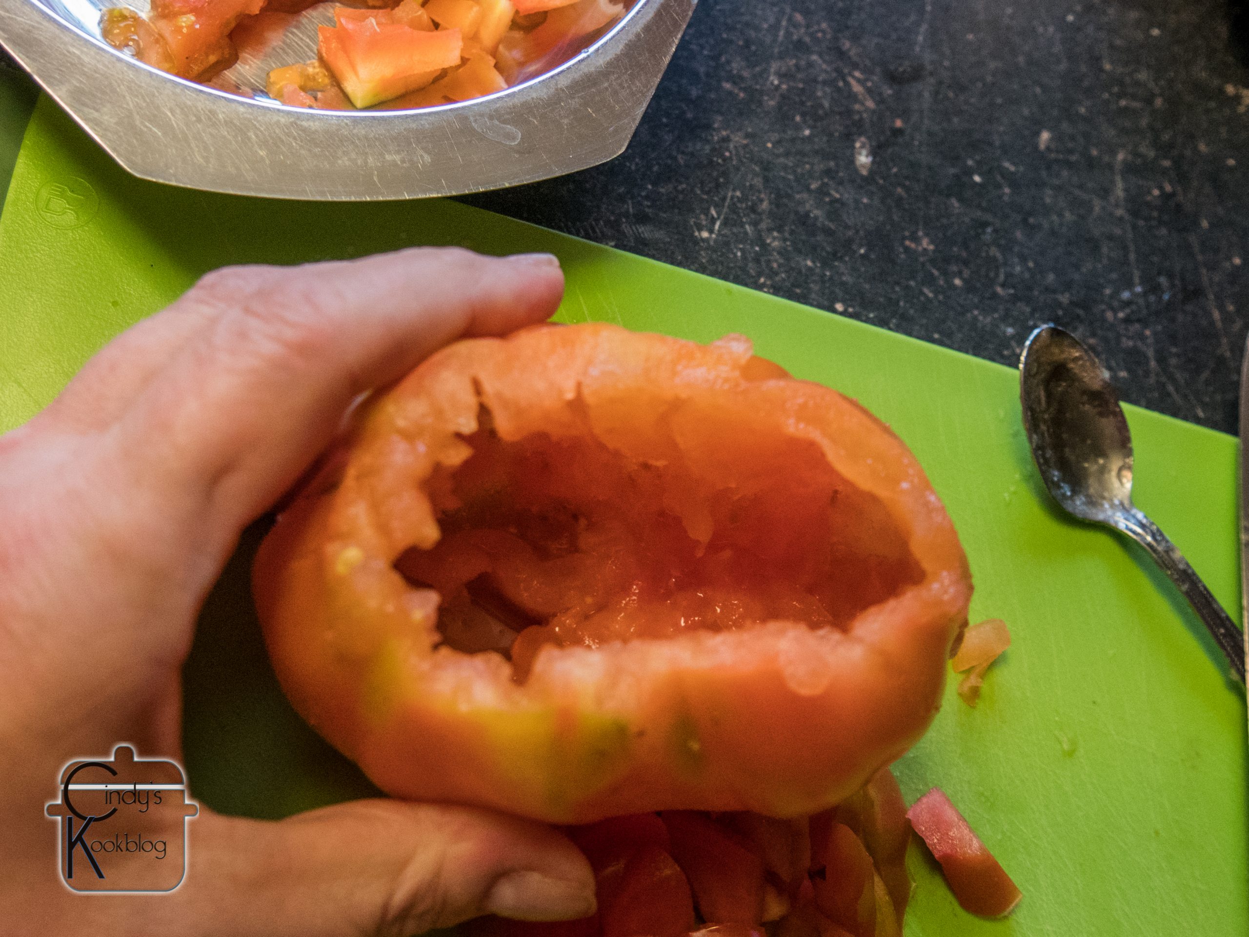 Hol de tomaten nu uit en hou alles wat je er uit haalt bij.