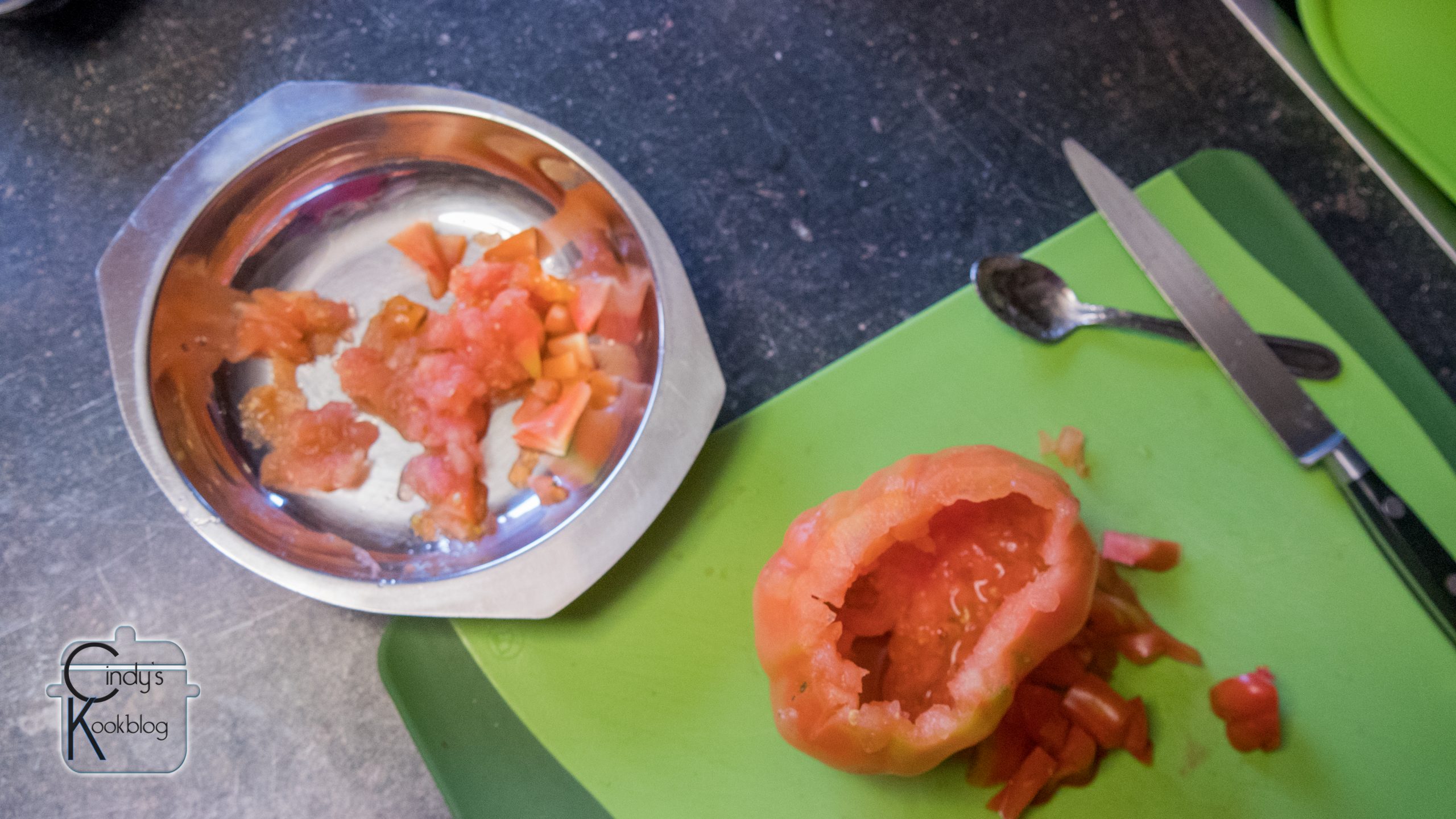 Het binnenste van de tomaten, snij je nu in kleine stukjes.