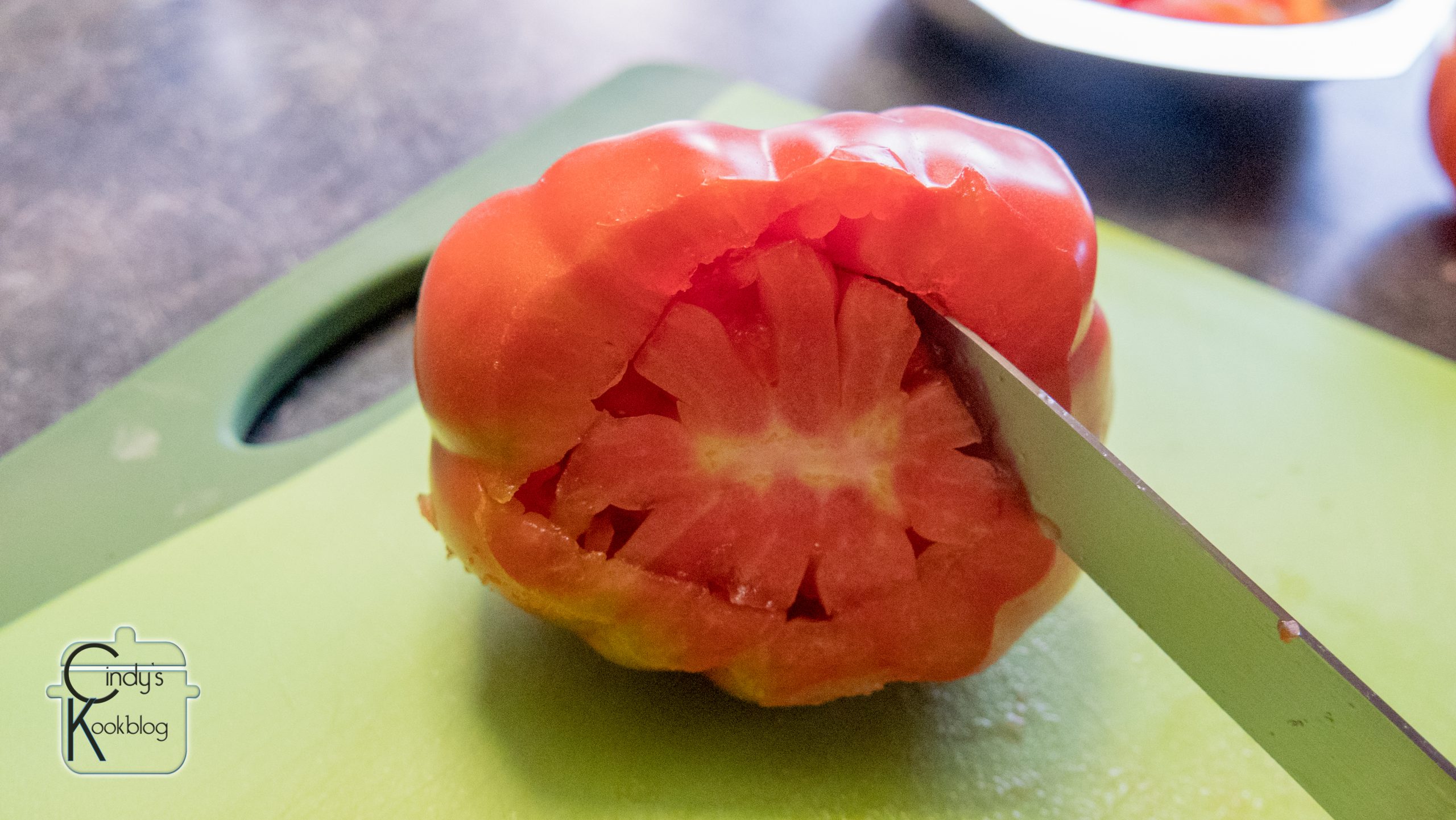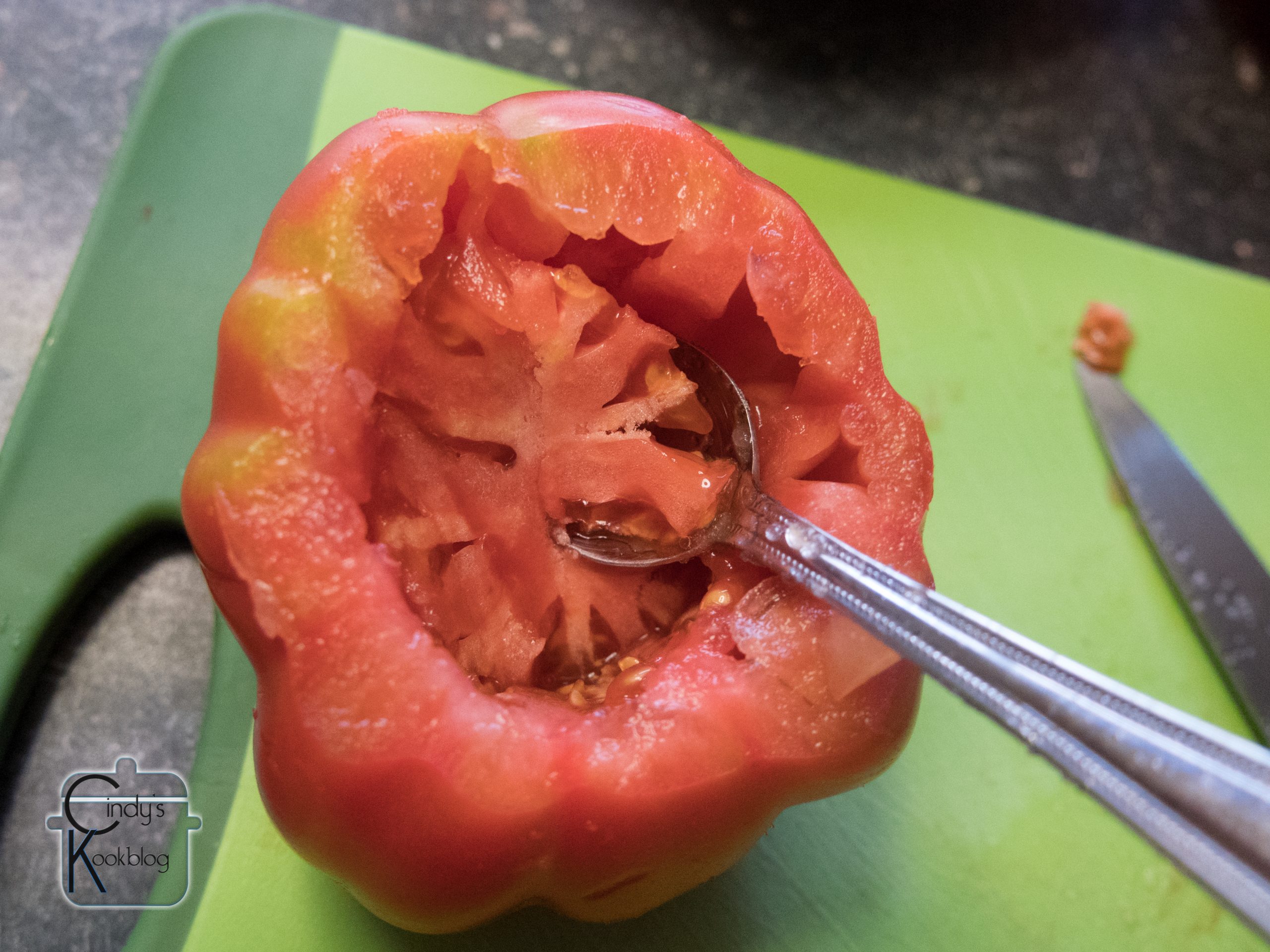 Zorg dat de meest platte kant naar onder staat, zodat de tomaat recht kan staan.