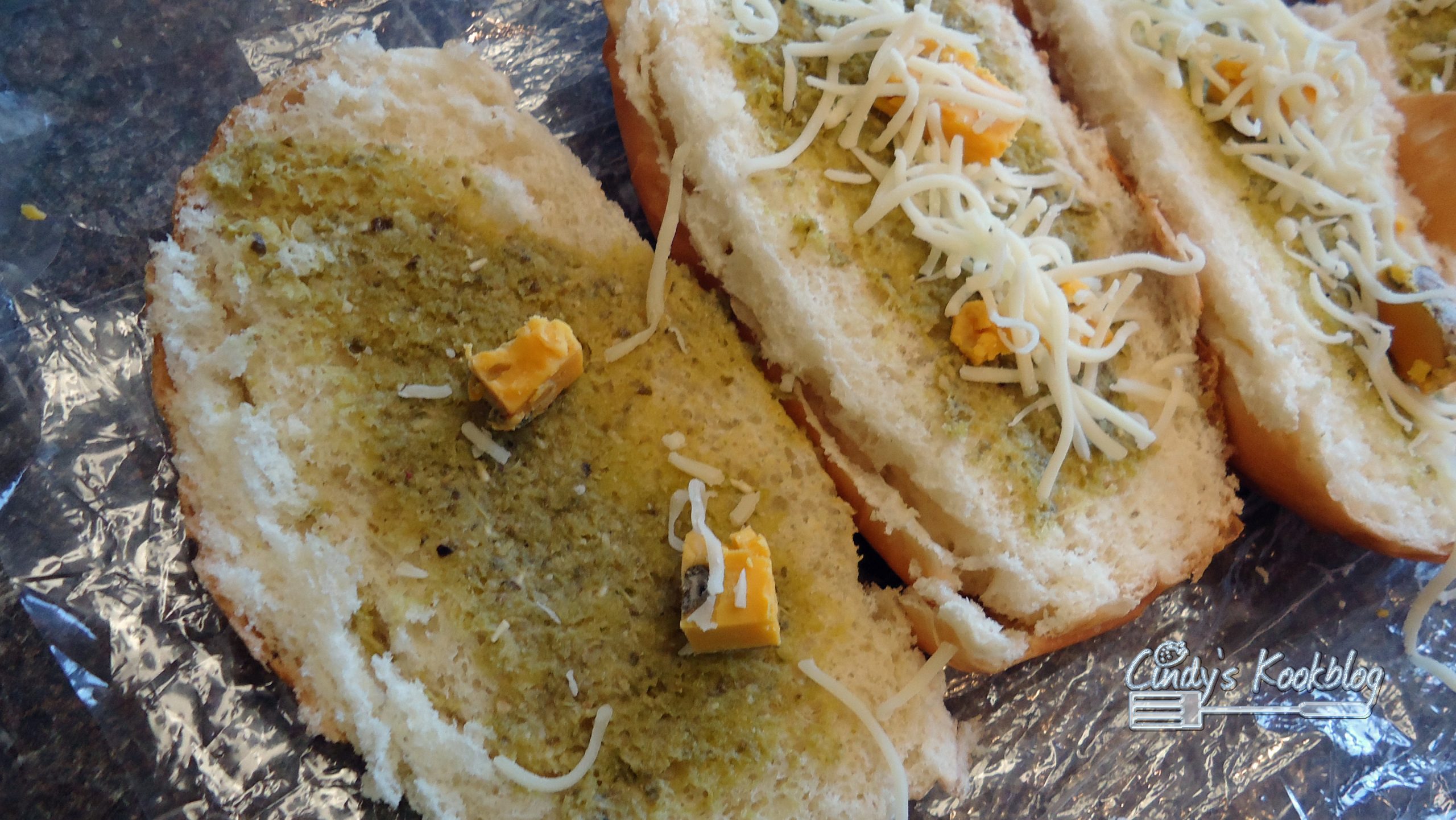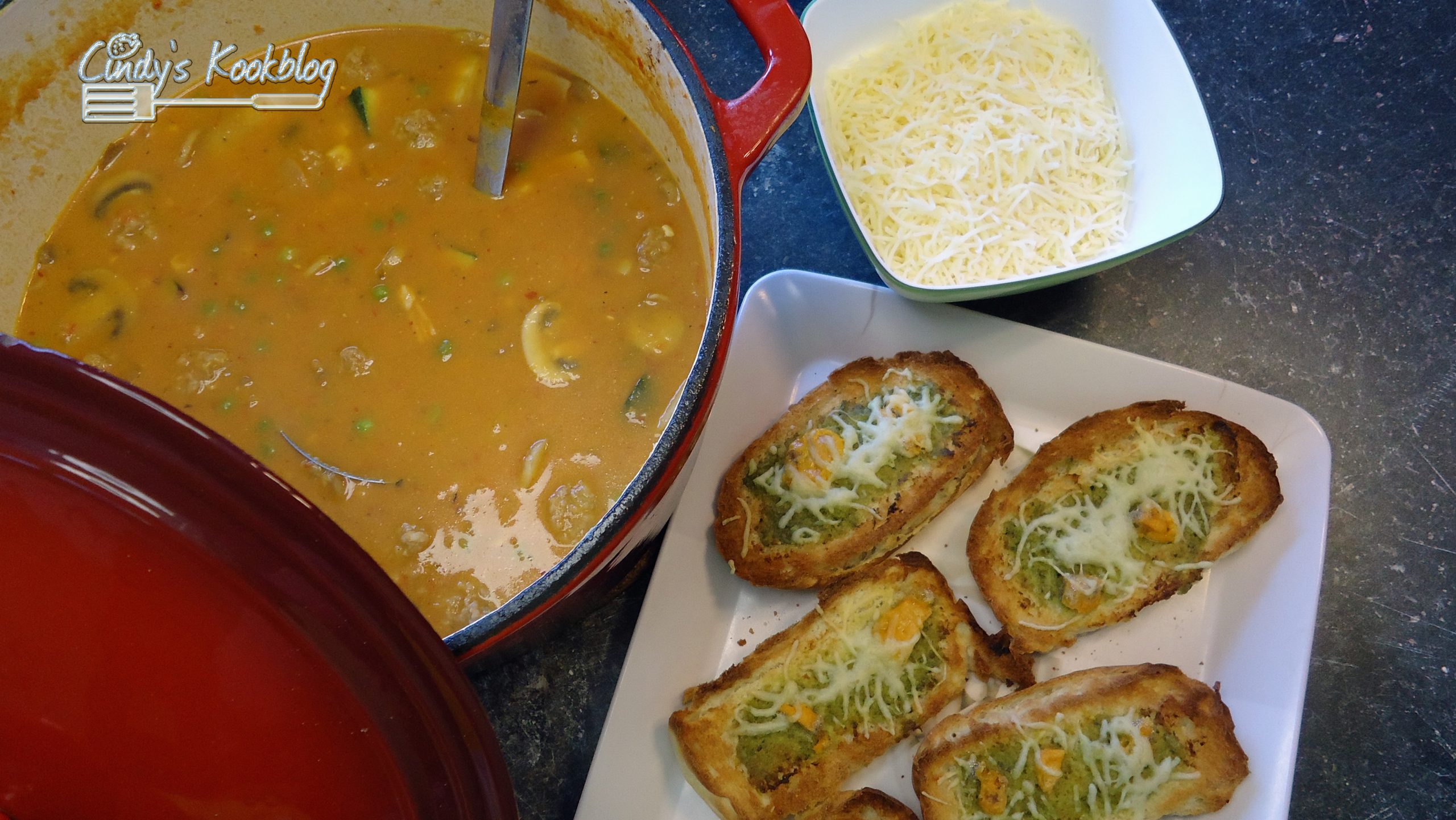 Die soep kan je serveren met gegrilde sandwiches, die je in twee snijdt, besmeerd met groene pesto en kaas die je hebt. In mijn geval was dat Blacksticks blue cheese in kleine blokjes en wat emmental.