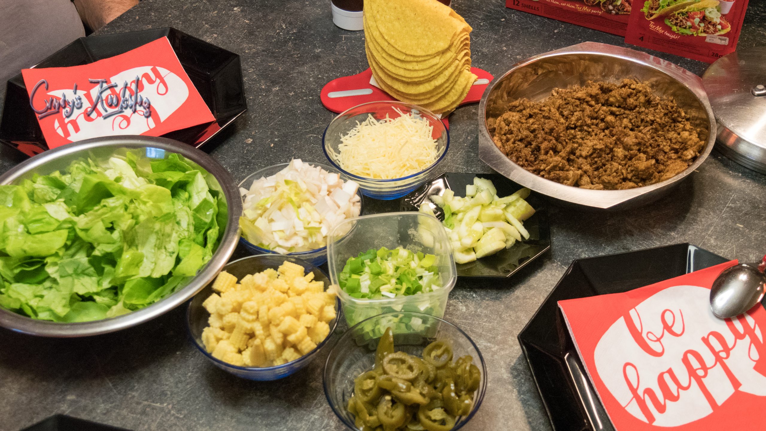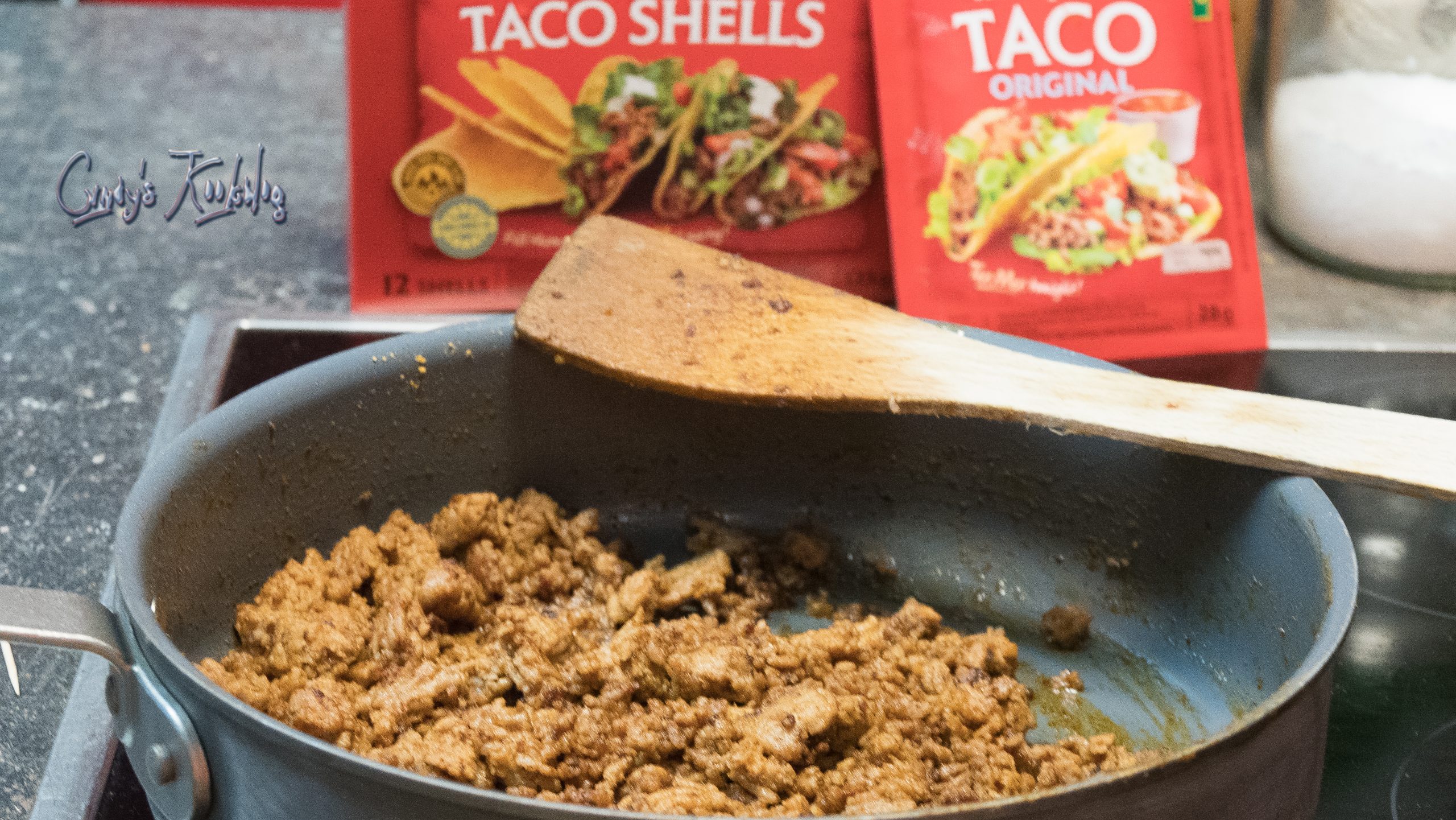 Je bakt je gehakt met de kruidenmix en dan kun je zelf bepalen welke garnering je erbij neemt.